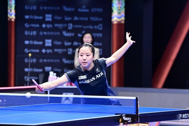 신유빈은 9일 수원 탁구전용경기장 스튜디오T(광교체육관)에서 열린 2023 두나무 한국프로탁구리그(KTTL) 여자 코리아리그 경기에서 한국마사회를 상대로 2경기에 나서 모두 이겼다.