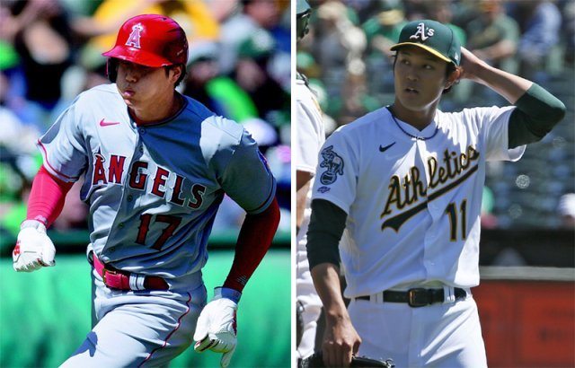 오타니 쇼헤이(LA 에인절스·왼쪽 사진)가 고교 시절 라이벌이었던 후지나미 신타로(오클랜드)와 2일 오클랜드에서 미국프로야구 메이저리그(MLB) 무대 첫 맞대결을 벌여 왼쪽 담장을 때리는 적시타로 판정승을 거뒀다. 오클랜드=AP 뉴시스