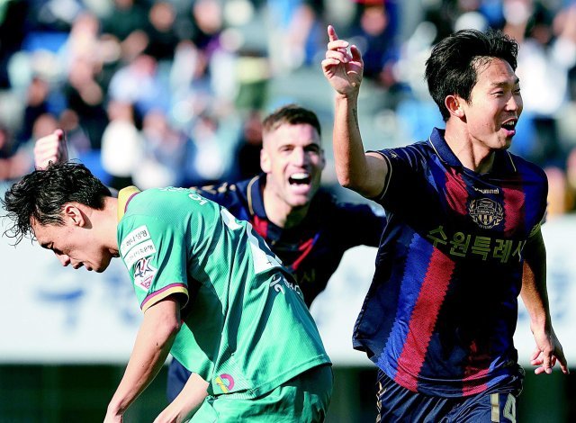 수원FC 윤빛가람(오른쪽)이 9일 수원종합운동장에서 열린 대전과의 안방경기에서 3-3이던 후반 35분 역전 결승골을 넣은 뒤