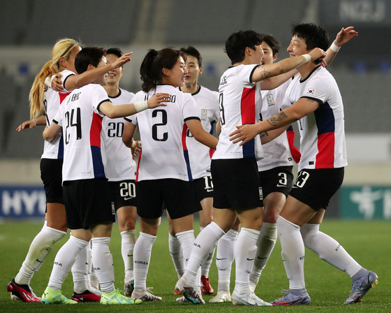 11일 오후 경기 용인미르스타디움에서 열린 ‘신세계 이마트 초청 여자축구국가대표팀 친선경기’ 대한민국과 잠비아 2차전 경기, 대한민국 이금민이 팀의 세 번째 골을 성공시킨 후 동료들과 기쁨을 나누고 있다. 2023.4.11/뉴스1