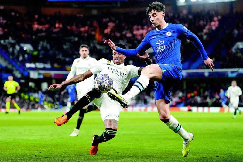 19일 열린 유럽축구연맹(UEFA) 챔피언스리그 8강 2차전에서 첼시의 카이 하베르츠(오른쪽)와 레알 마드리드의 에데르 밀리탕이 볼을 다투고 있다. 레알 마드리드가 2-0 승리를 거두고 1, 2차전 합계에서 4-0으로 앞서 4강에 올랐다. 런던=AP 뉴시스