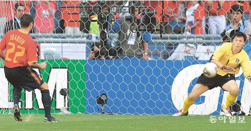 21년전 ‘그 장면’ 올 시즌을 끝으로 은퇴를 선언한 스페인의 호아킨 산체스(왼쪽)가 2002년 한일 월드컵 8강전 한국과의 경기에서 승부차기를 하는 모습. 호아킨의 슛은 골키퍼 이운재에게 막혔다. 동아일보DB