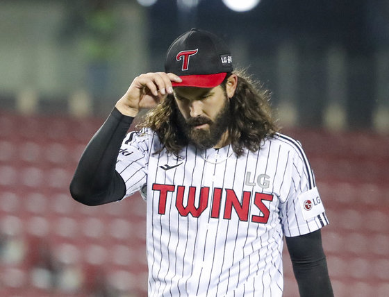 19일 오후 서울 송파구 잠실야구장에서 열린 2023 신한 SOL KBO리그 NC 다이노스와 LG 트윈스의 경기,LG 켈리가 3회초 4실점 후 덕아웃으로 들어가고 있다. 2023.4.19 뉴스1