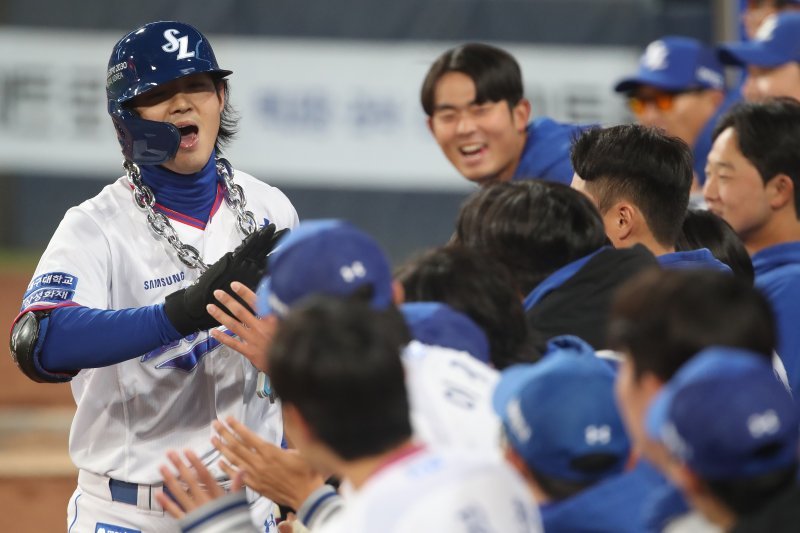 프로야구 삼성의 구자욱(왼쪽)이 26일 두산과의 안방경기에서 결승 1점 홈런을 터뜨린 뒤 동료들과 기쁨을 나누고 있다. 대구=뉴스1