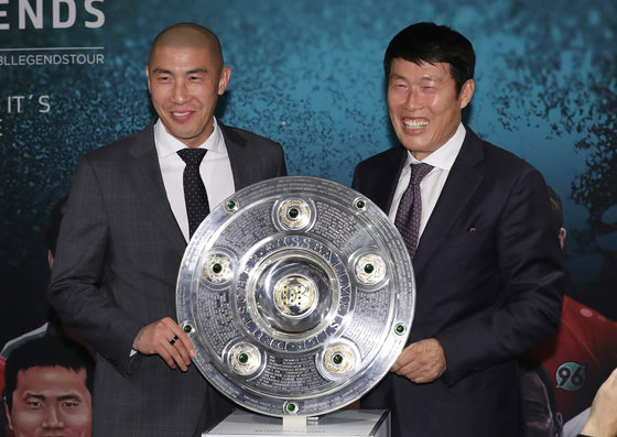 차범근 전 감독과 차두리 코치가 2일 오전 서울 용산구 한남동 그랜드 하얏트 호텔에서 열린 ‘분데스리가 레전드 투어 IN 코리아’ 기자회견에서 분데스리가 우승 트로피를 들고 기념촬영을 하고 있다. 2017.11.2. 뉴스1