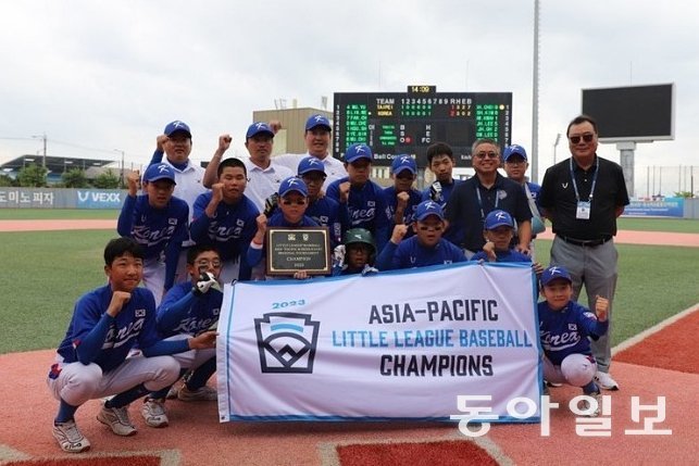2023 리틀리그 월드시리즈 아시아-태평양 지역 챔피언에 오른 한국 리틀야구 대표팀. 한국리틀야구연맹 제공