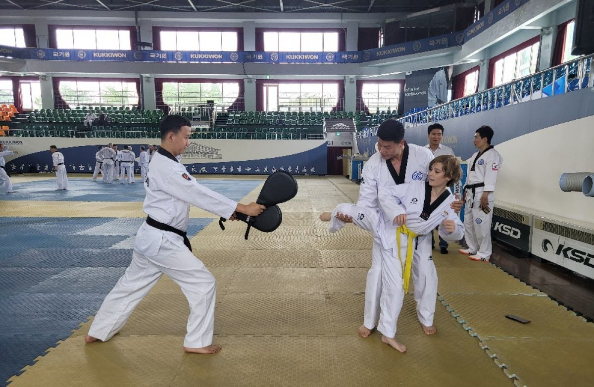 불가리아 옛 왕실의 왕세손 시메온 하산 무뇨즈(오른쪽 노란띠)가 20일 서울 강남구 국기원 중앙수련장에서 정봉현 국기원 특별보좌관(무뇨즈 뒤쪽)의 지도 하에 발차기 동작을 배우고 있다. 국기원 제공