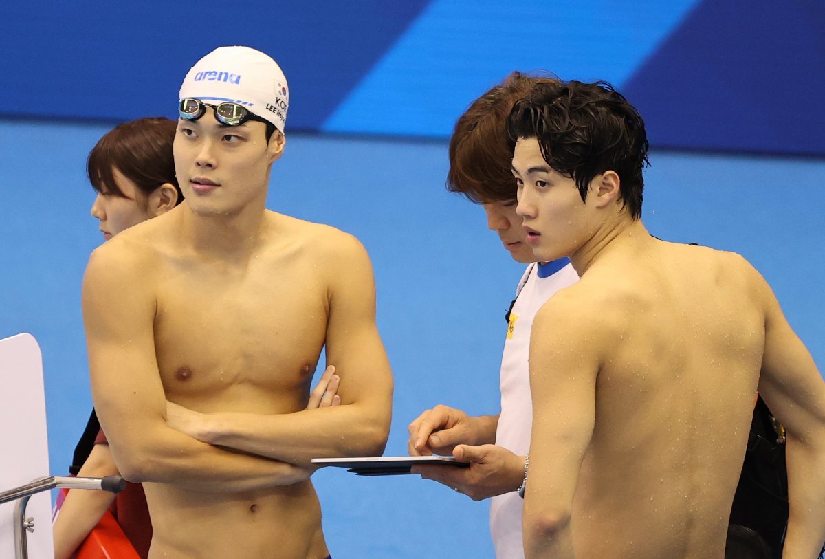 2023 국제수영연맹 세계선수권대회 남자 계영 800m 예선을 하루 앞둔 27일 수영 국가대표팀 이호준(왼쪽), 황선우가 일본 후쿠오카 마린 메세 후쿠오카홀에서 훈련지시를 받고 있다. 후쿠오카=뉴스1