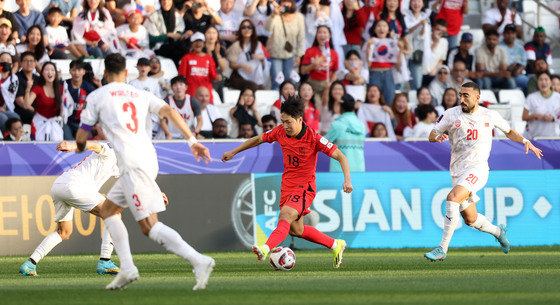 대한민국 축구대표팀 이강인이 15일(현지시간) 카타르 도하 자심 빈 하마드 스타디움에서 열린 2023 아시아축구연맹(AFC) 카타르 아시안컵 조별리그 E조 대한민국과 바레인의 경기에서 돌파하고 있다. 2023.1.15. 뉴스1