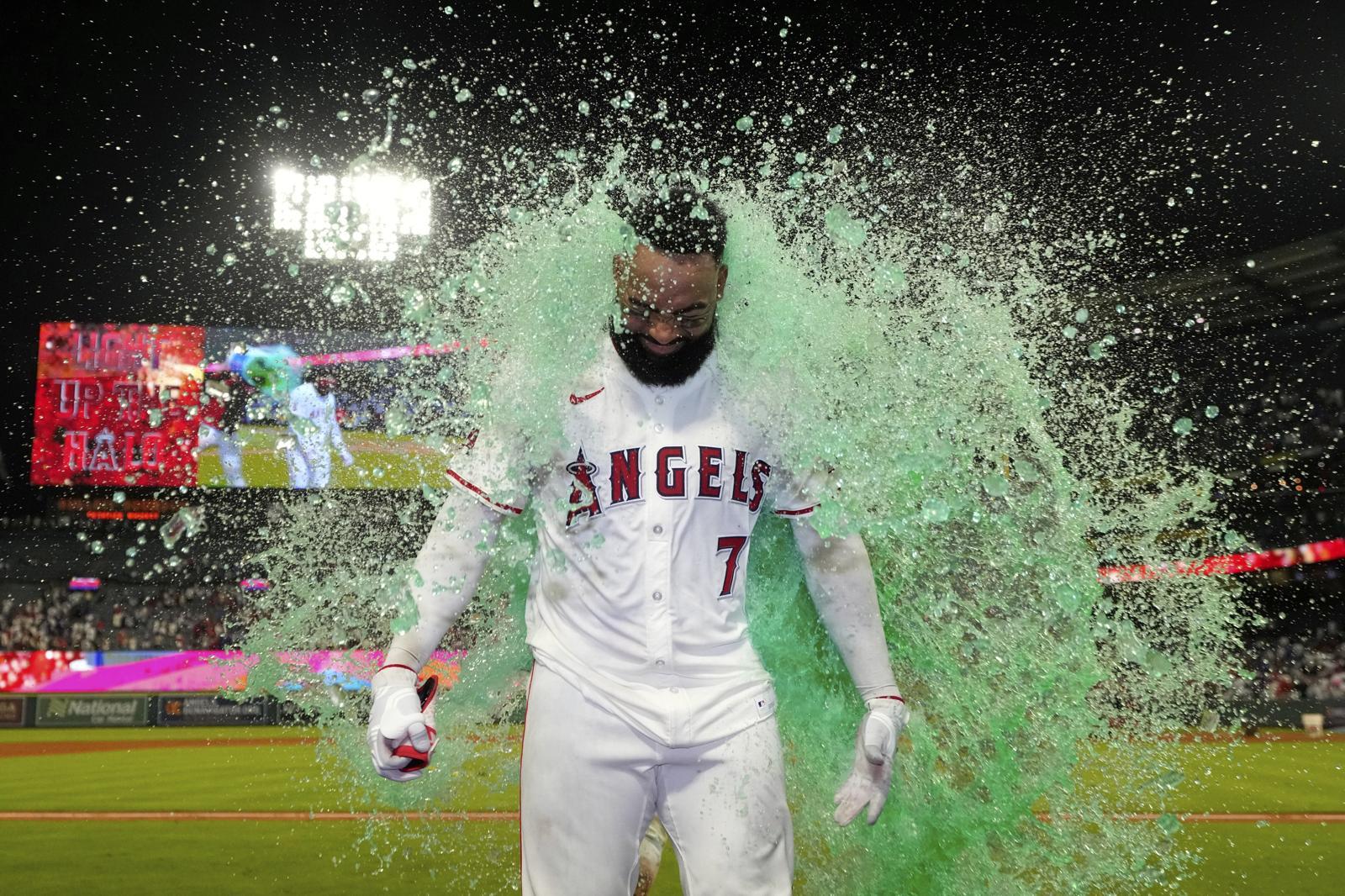 조 에이델(LA 에인절스)이 13일 지역 라이벌 LA 다저스와의 미국프로야구 메이저리그 안방경기에서 10회말 끝내기 안타를 친 뒤 음료수 세례를 받고 있다. 에인절스는 이날 7-6 역전승을 거두고 올해 맞대결 5전 전승을 이어갔다.