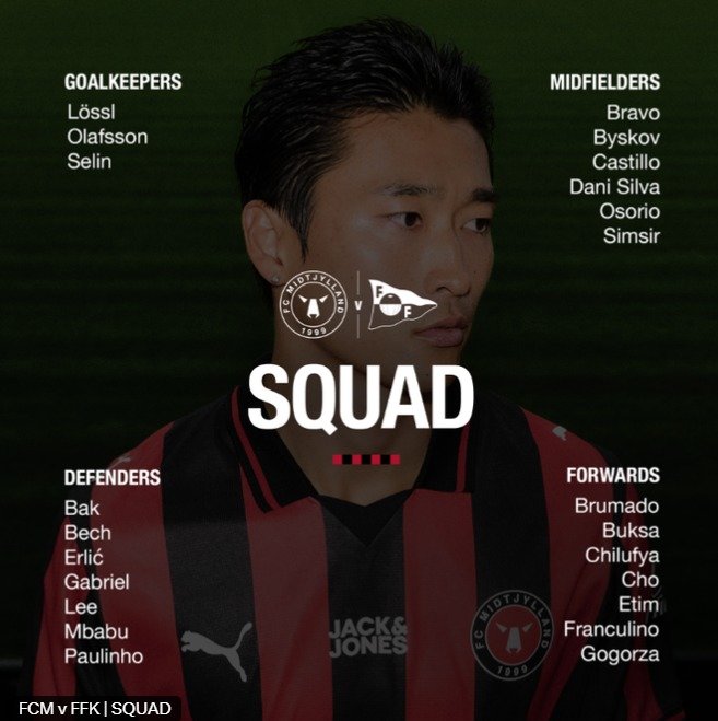 미트윌란(덴마크) 공격수 조규성이 15일(한국시간) 열리는 프레드릭스타드(노르웨이)와 2025-26 유럽축구연맹(UEFA) 유로파리그(UEL) 3차 예선 홈 2차전 스쿼드에 포함됐다. 미트윌란 SNS 캡처