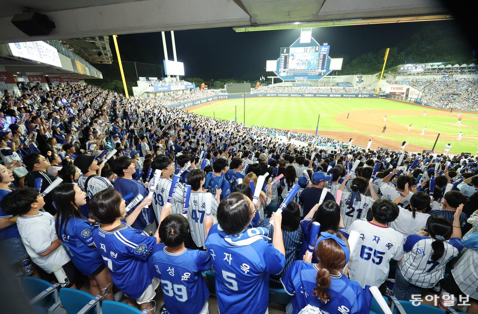 프로야구 삼성 팬들이 11일 SSG와의 경기가 열린 대구 삼성라이온즈파크에서 열띤 응원을 보내고 있다. 이날 2만4000명의 만원 관중이 들어차 시즌 50번째 매진을 기록한 삼성은 올 시즌 10개 구단 중 최다 누적 관중(147만3262명·11일 현재)을 기록 중이다. 대구=장승윤 기자 tomato99@donga.com