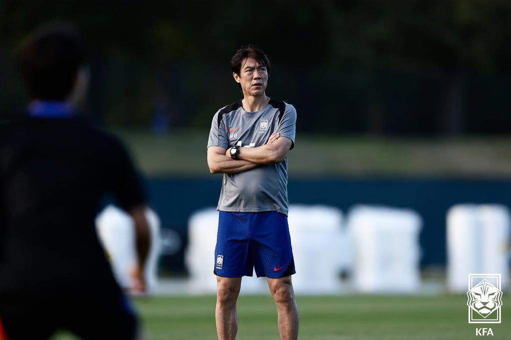 축구국가대표팀 홍명보 감독이 4일(현지 시간) 미국 뉴욕주 아이칸 스타디움에서 2026 북중미 월드컵 대비 미국과의 평가전을 앞두고 훈련하는 대표팀을 바라보고 있다. 대한축구협회 제공