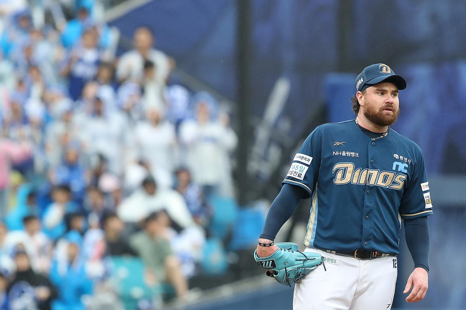 7일 오후 대구 삼성라이온즈파크에서 열린 프로야구 2025 신한 SOL뱅크 KBO 와일드카드 결정전 2차전, 삼성 라이온즈와 NC 다이노스의 경기, 1회말 2사 만루 상황 볼넷으로 이성규와 강민호에게 연속 실점을 허용한 NC 선발 로건이 아쉬워하고 있다. 2025.10.7/뉴스1