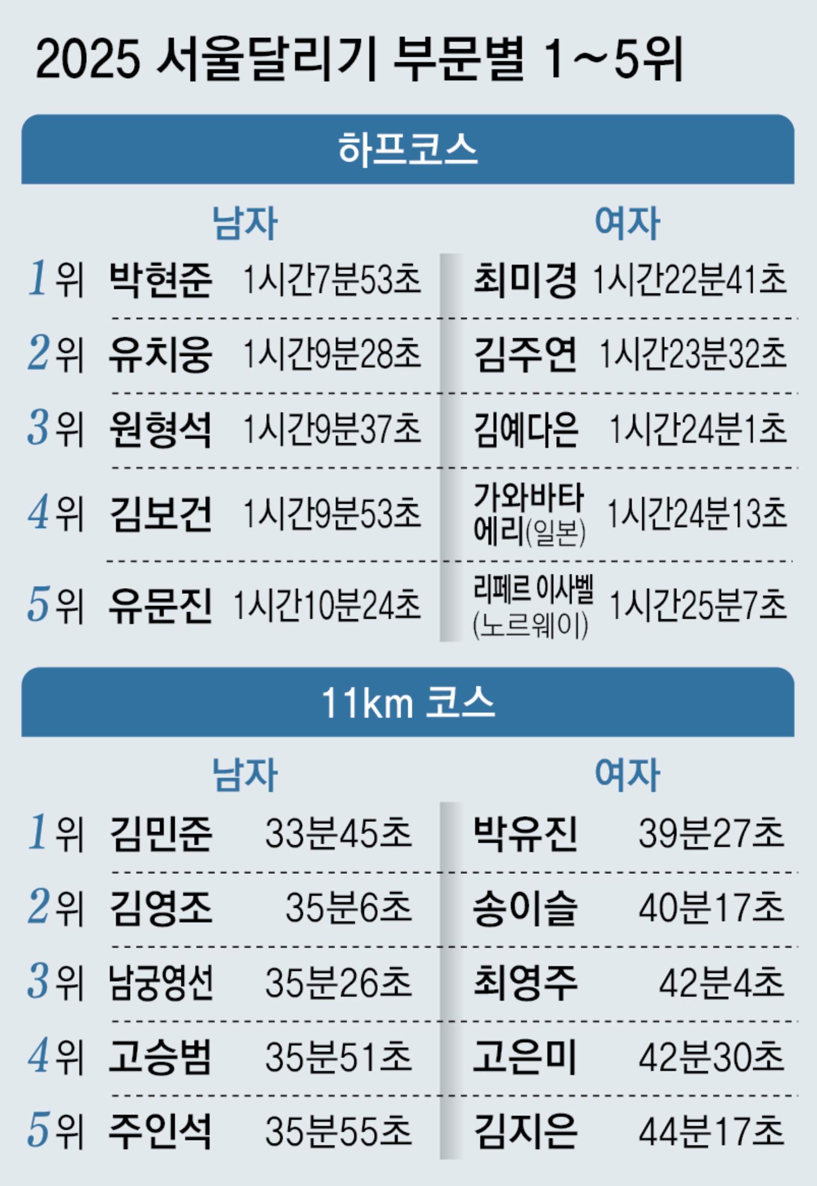 男 11㎞ 1위 김민준 씨(왼쪽), 女 11㎞ 1위 박유진 씨.11km 코스 남자부에서는 김민준 씨(42)가 33분45초의 기록으로 우승했다. 엘리트 선수 출신인 김 씨는 심리적 부담감으로 인해 14년 전 선수 생활을 그만뒀다. 현재 그는 선수 컨디셔닝 관리숍을 운영 중이다. 그의 고객 중엔 유명 러닝 크리에이터인 ‘스톤’ 원형석 씨(31)가 있다. 이 때문에 김 씨는 마스터스 러너들 사이에서 ‘스톤의 마사지 선생님’으로 불렸다. 하지만 올해 김 씨가 각종 대회에 출전해 입상하면서 지금은 ‘스톤만큼 잘 뛰는 마스터스 러너’라는 말을 듣고 있다. 김 씨는 “다시 달리다 보니 과거에 나를 괴롭혔던 스트레스가 풀리더라”라며 웃었다. 김 씨는 18일 열리는 2025 경주국제마라톤에선 풀코스에 도전한다. 11km 코스 여자부에선 러닝 코치 박유진 씨(34)가 39분27초로 가장 먼저 결승선을 통과했다.