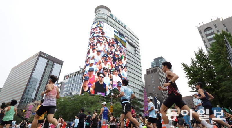 가을과 함께한 서울달리기… 1만2800명 도심 누볐다 가을철 서울 도심 최대 달리기 축제인 2025 서울달리기(서울시, 동아일보 공동 주최) 참가자들이 12일 출발지인 서울 청계광장 앞 세종대로를 힘차게 뛰어 나가고 있다. 올해 대회에는 역대 최다인 1만2800여 명이 참가했다. 이날 레이스 출발 장면은 동아미디어센터가 시험 운영 중인 국내 최대 미디어 사이니지 ‘룩스(LUUX)’를 통해 실시간으로 송출됐다. 박형기 기자 oneshot@donga.com올해 대회에는 지난해까지 레이스 초반에 포함됐던 경복궁 담벼락을 한 바퀴 도는 코스가 제외됐다. 세종대로에서 청와대로 향하는 오르막을 뛰는 대신 종로에서 동대문 방향으로 곧장 진입하는 코스로 바뀌었다. 과거보다 평탄해진 코스로 초반 페이스 조절이 한결 쉬워지면서 개인 최고기록(PB)을 경신한 러너도 많이 나왔다. 러닝 크리에이터 ‘임바’로 알려진 유문진 씨(35)는 역대 개인 최고 기록인 1시간10분24초로 하프코스 남자부 5위에 올랐다. 유 씨는 “(하프코스와 11km 코스) 참가자들끼리 주로가 겹치지 않도록 대회가 진행돼 좋았다. 도심 한가운데를 달리며 주위 풍경을 마음껏 즐기며 뛸 수 있었다”고 했다.