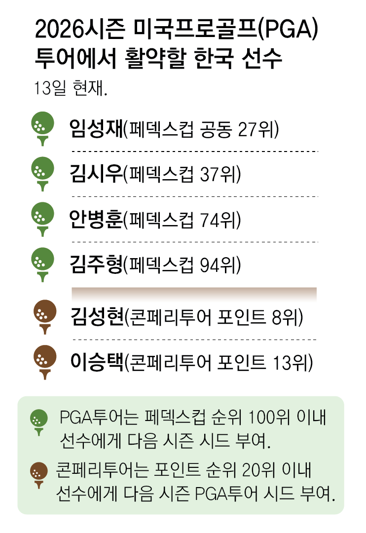 이승택은 13일 미국 인디애나주 프렌치릭 리조트(파72)에서 열린 콘페리(2부)투어 최종전 콘페리투어 챔피언십에서 공동 24위(2언더파 286타)로 대회를 마쳤다. 콘페리투어 포인트 36.83점을 추가하며 총점 1133.85점을 기록한 이승택은 13위에 자리하며 2026시즌 PGA투어 진출을 확정지었다. 이승택은 “어린 시절부터 키워 온 오랜 꿈을 이뤘다. 말로 표현할 수 없을 만큼 가슴이 뛴다”고 벅찬 소감을 밝혔다.