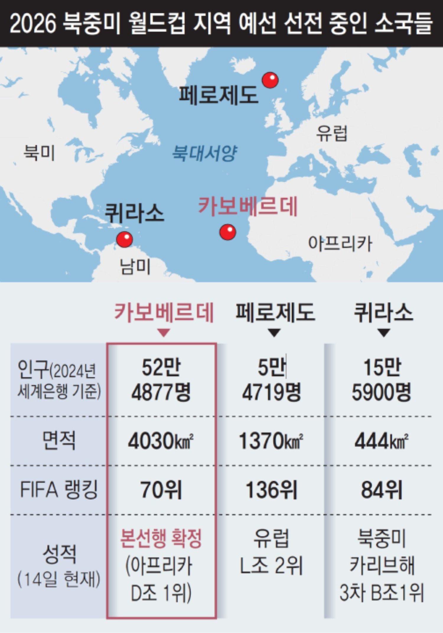 세계지도로 보면 점 하나 크기에 불과한 작은 나라들이 2026년 국제축구연맹(FIFA) 북중미 월드컵을 앞두고 큰바람을 일으키고 있다. 많은 이들에게 이름조차 생소한 카보베르데, 페로제도, 퀴라소 등이 주인공이다.