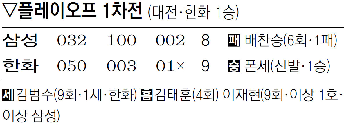 1승 1패 동률이지만 흐름을 가져왔다. 프로야구 삼성이 정규시즌에서 33승을 합작한 한화 ‘원투펀치’ 폰세, 와이스를 연달아 두들기고 안방 대구로 돌아간다.