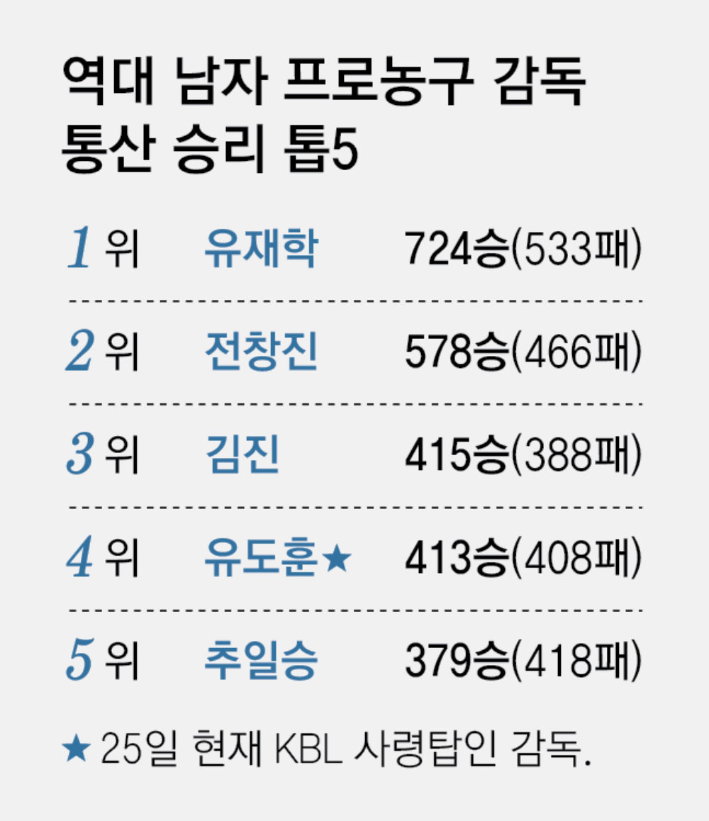 유도훈 정관장 감독(58)은 이번 시즌 남자 프로농구 사령탑 중 가장 나이가 많다. 오랜 시간만큼 경륜도 쌓였다. 사령탑으로 17번째 시즌을 치르고 있는 유 감독은 25일 현재 역대 남자 프로농구 감독 중 통산 승리 횟수 4위(413승)에 자리해 있다.