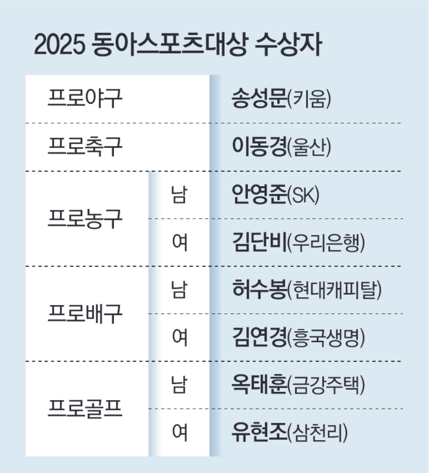 프로축구에서는 전날 K리그1 MVP에 오른 이동경(28·울산)이 올해의 선수상을 받았다. 김천(상무) 소속이던 지난해에 이어 2회 연속 수상이다. 프로축구 선수 최초로 2년 연속 이 상을 받은 이동경은 “내년에 3년 연속으로 받을 수 있도록 더 노력하겠다”고 말했다.