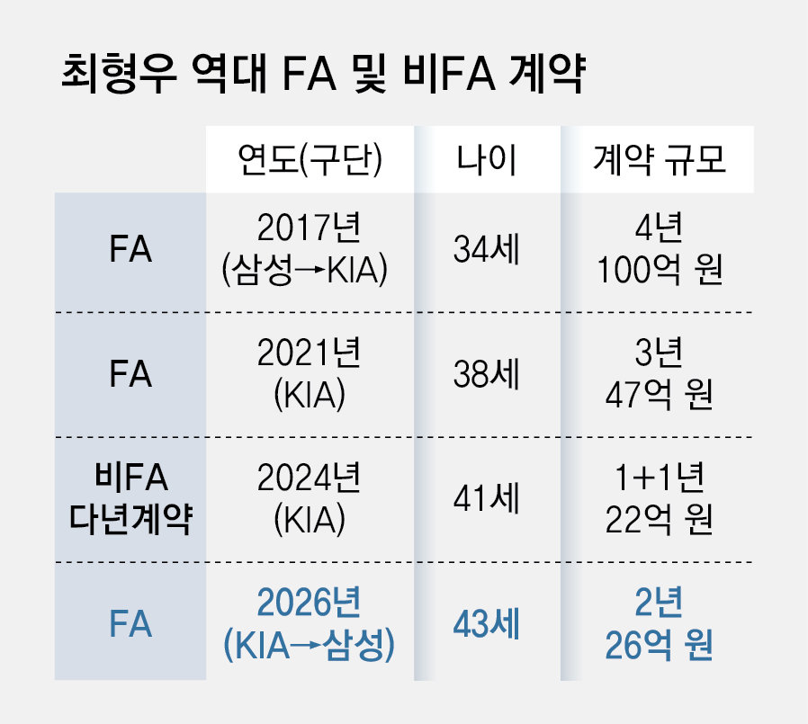 2016년 삼성을 떠나며 한국프로야구 최초로 자유계약선수(FA) 100억 원 시대를 열었던 최형우(42)가 세 번째 FA 계약을 맺으며 9년 만에 친정팀으로 복귀한다. 프로야구 삼성은 최형우와 2년 총액 26억 원에 FA 계약을 맺었다고 3일 발표했다.