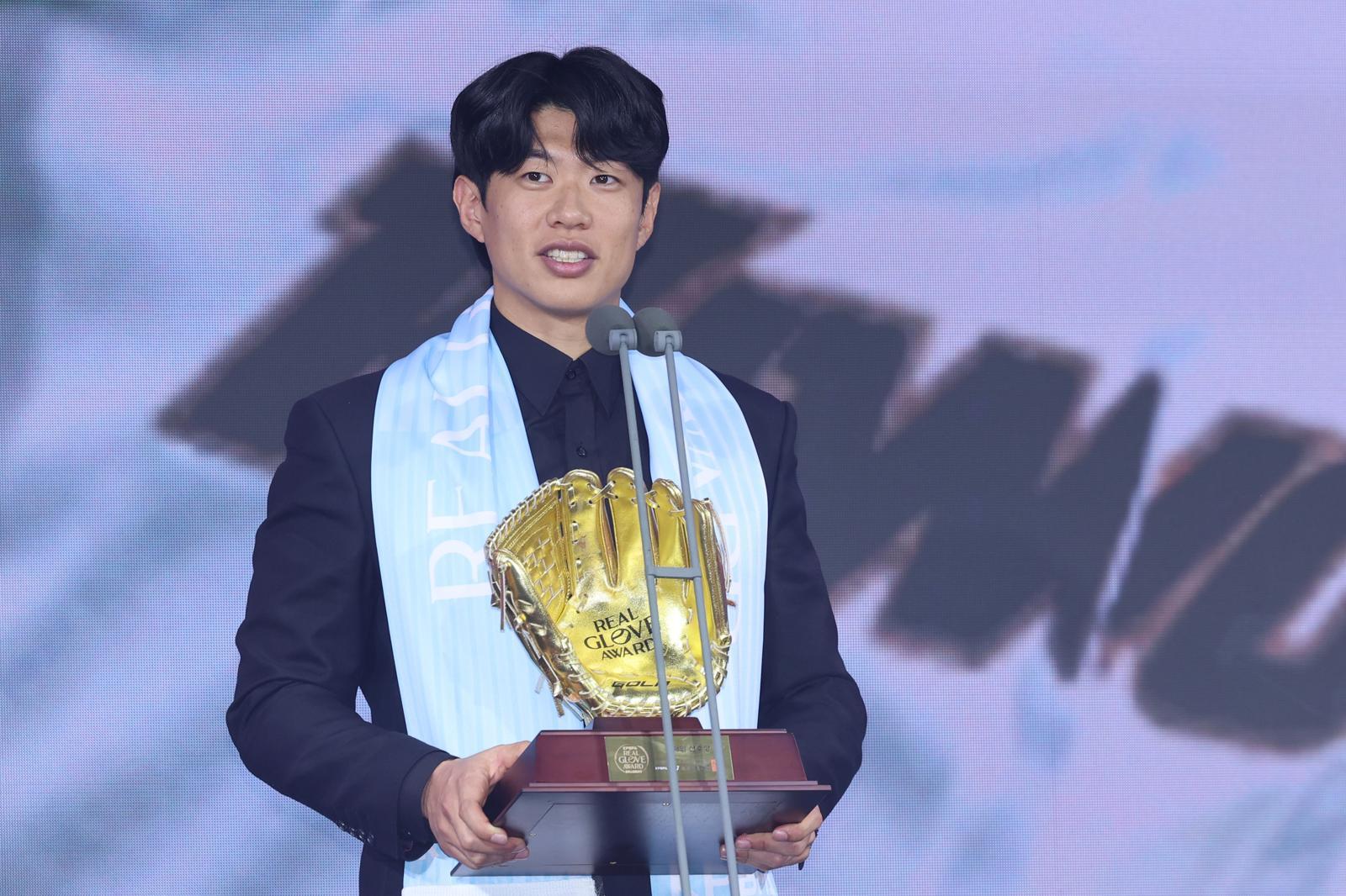 1일 서울 광진구 그랜드 워커힐 서울에서 열린 ‘2025 컴투스프로야구 리얼글러브 어워드’에서 올해의 선수상을 수상한 키움히어로즈 송성문이 수상소감을 밝히고 있다. 리얼글러브 어워드는 한국 프로야구 선수들이 직접 투표를 통해 동료 선수들의 활약을 평가하고 각 포지션별 최고의 선수를 선정하는 국내 유일의 선수 주도형 시상식이다. 2025.12.01. [서울=뉴시스]