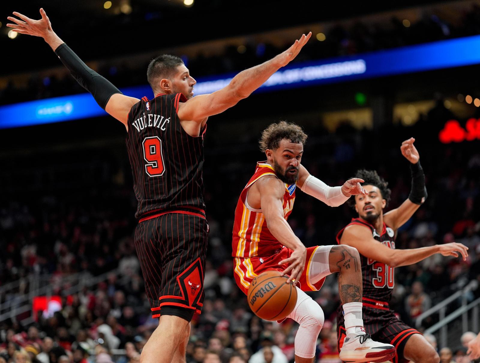 애틀랜타 가드 트레이 영(가운데)이 24일 열린 2025∼2026시즌 미국프로농구 시카고와의 안방경기 4쿼터 때 상대 센터 니콜라 부세비치(왼쪽)의 블록을 피해 동료에게 패스하고 있다. 이날 3쿼터까지 105-92로 앞서던 애틀랜타는 4쿼터에 18득점에 그치는 동안 34점을 내주며 123-126로 역전패했다.