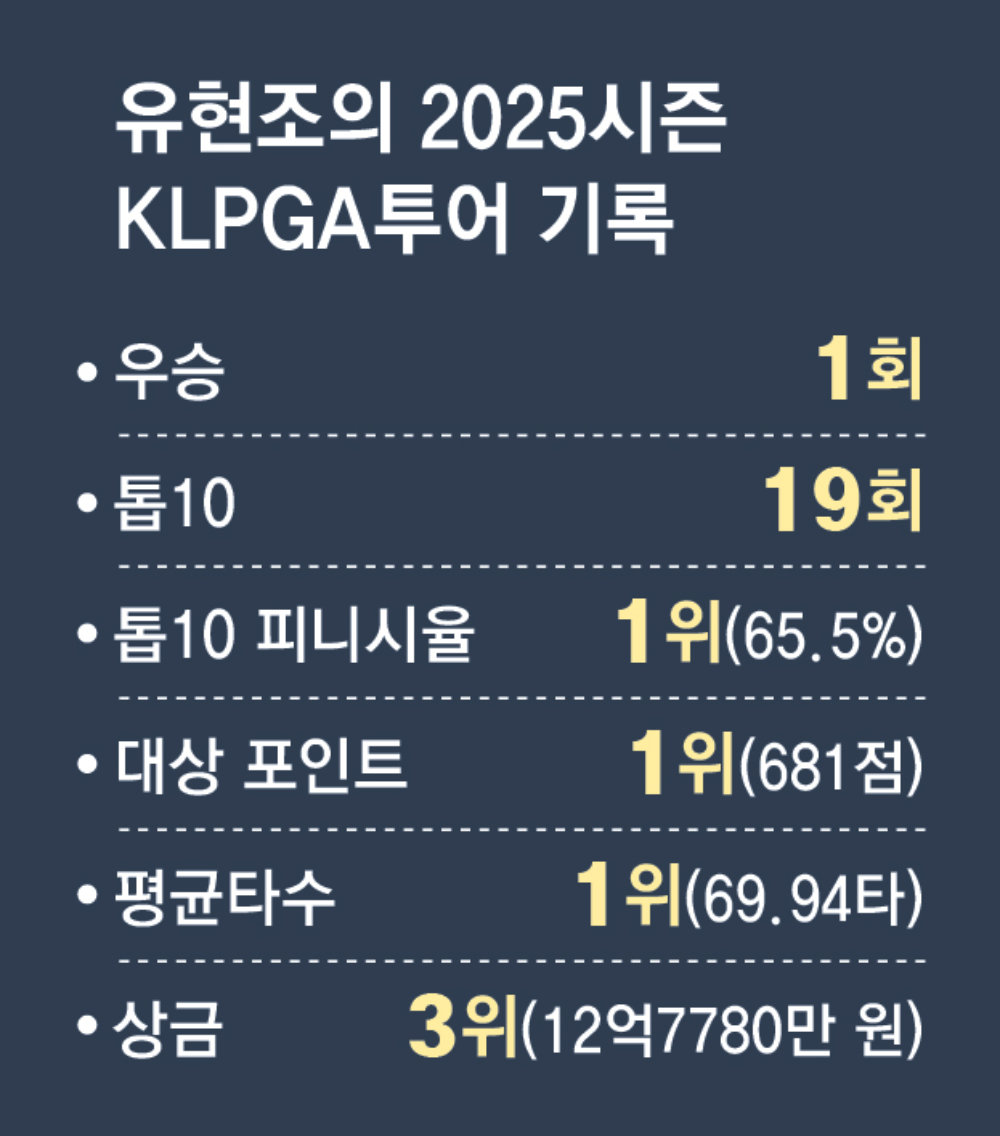 각종 기록을 세우며 화려한 시즌을 보냈지만 유현조에게 만족은 없다. 유현조는 올해 29개 대회에 참가해 19차례 ‘톱10’에 이름을 올렸다. 톱10 피니시율이 65.6%로 1위였지만 정작 우승 트로피를 들어올린 건 단 한 번뿐이었다. 반면 톱10 피니시율(44.4%) 2위인 홍정민(23)은 세 번이나 우승했다. 유현조는 “올 시즌 우승이 나오기 전까지 준우승과 3위를 다섯 차례나 해 계속 답답한 마음이 있었다”며 “우승을 하고 싶은 마음이 커지다 보니까 오히려 시야가 좁아졌다. 최종일에 실력 발휘를 못해 우승을 많이 놓친 것 같다”고 말했다.