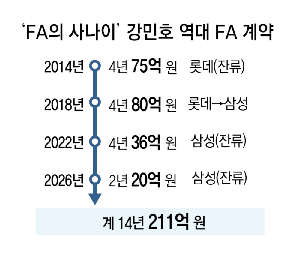 2004년 롯데에 입단한 강민호는 첫 FA 자격을 얻은 2014년 4년 75억 원을 받고 롯데에 남았다. 2018년 2번째 FA가 돼서는 4년 80억 원의 조건에 삼성으로 이적했고, 2022년엔 삼성과 4년 36억 원에 세 번째 FA 계약을 했다. 이번 계약으로 강민호는 FA 계약으로만 총 211억 원의 수입을 올리게 됐다. 이는 프로야구 통산 다년계약 총수입 5위에 해당한다. SSG 내야수 최정(302억 원)이 가장 많고 두산 포수 양의지(277억 원), SSG 투수 김광현(257억 원), KT 외야수 김현수(255억 원) 순이다.