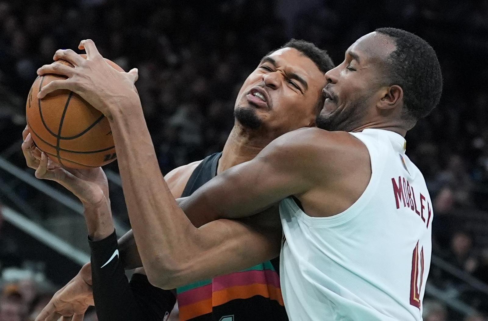 빅토르 웸반야마(샌안토니오·왼쪽)가 30일 열린 2025∼2026시즌 미국프로농구(NBA) 안방경기에서 클리블랜드 에번 모블리의 파울에 가로막히고 있다. 웸반야마는 이날 26득점, 14리바운드로 ‘더블더블’ 활약을 펼쳤지만 팀은 101-113으로 져 2연패에 빠졌다.