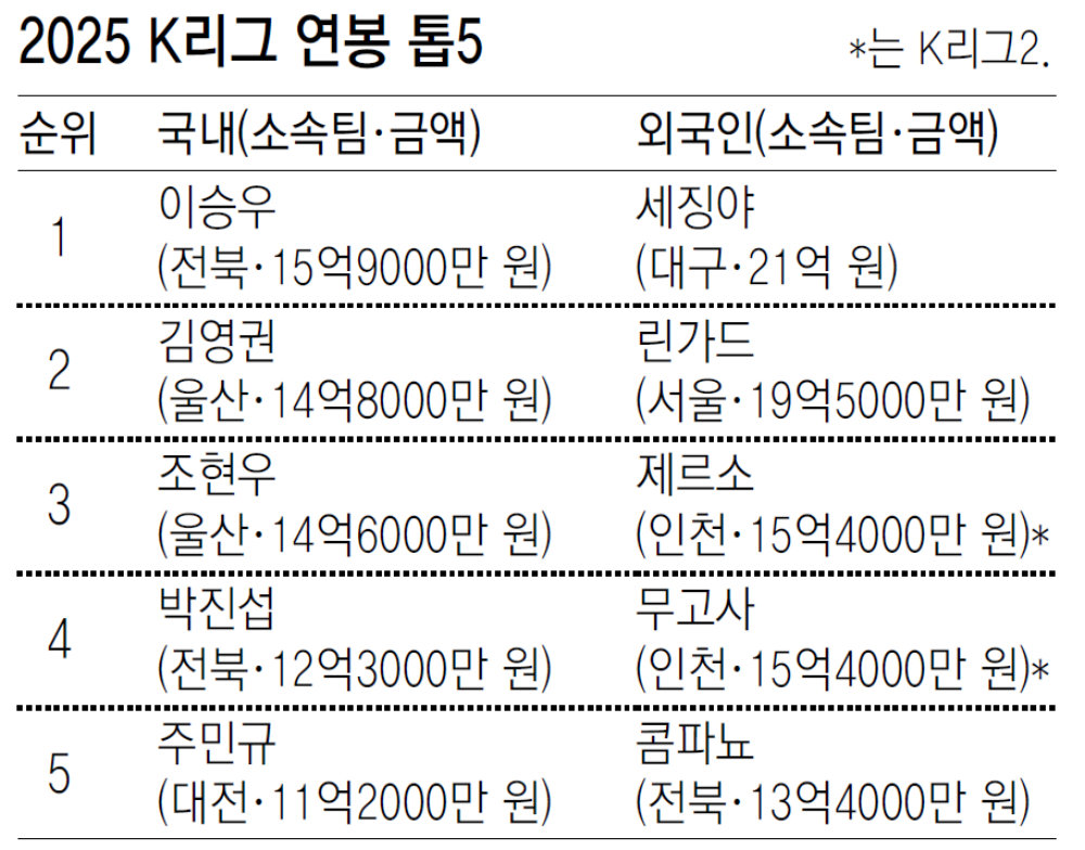한국프로축구연맹은 30일 K리그1(1부) 11개 구단과 K리그2(2부) 14개 구단 선수들의 2025년 연봉 지출 현황을 공개했다. 연봉은 기본급과 함께 출전, 승리 등 각종 수당 등이 포함된 실 지급액 기준이다. K리그는 물론이고 코리아컵과 아시아축구연맹(AFC) 클럽대항전 등에서 지급된 금액도 모두 포함됐다.