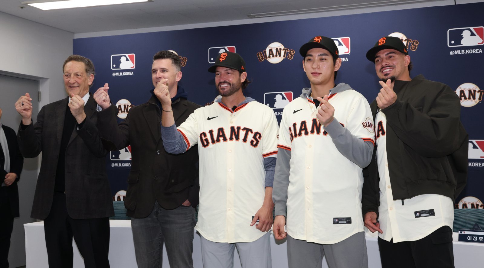 메이저리그 샌프란시스코 자이언츠가 7일 경기 이천시 LG챔피언스파크에서 방한 공식 기자회견을 진행 후 기념촬영을 하고 있다. 사진 왼쪽부터 래리 베어 CEO, 버스터 포지 사장, 토니 바이텔로 감독, 이정후, 윌리 아다메스. 2026.1.7/뉴스1