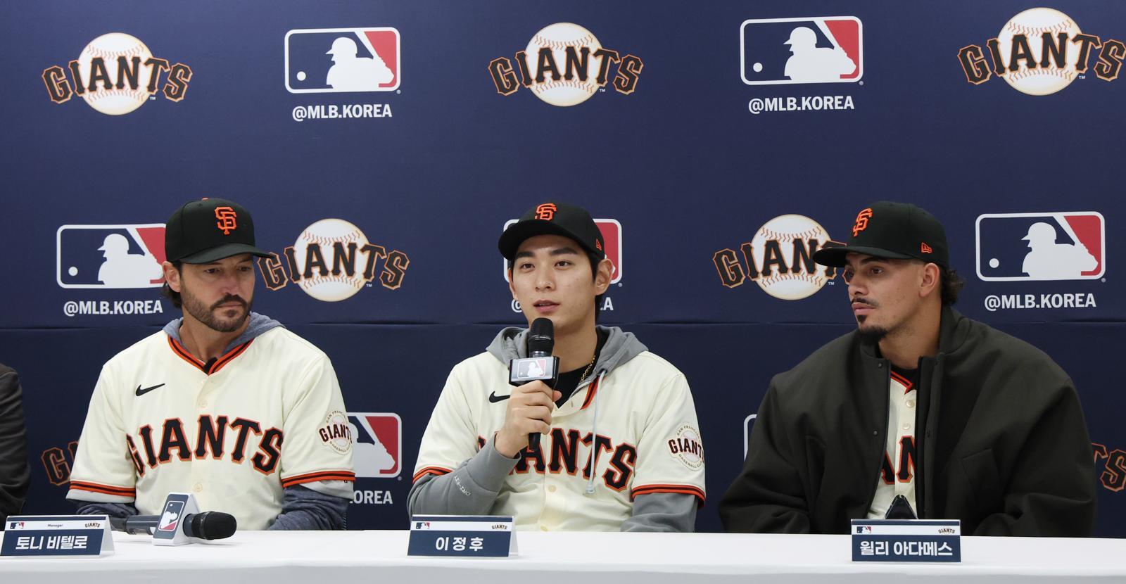 이정후(가운데·샌프란시스코)가 7일 경기 이천LG챔피언스파크에서 열린 야구 크리닉 행사를 앞두고 기자회견에 참석해 취재진의 질문에 답변하고 있다. 이천=뉴스1