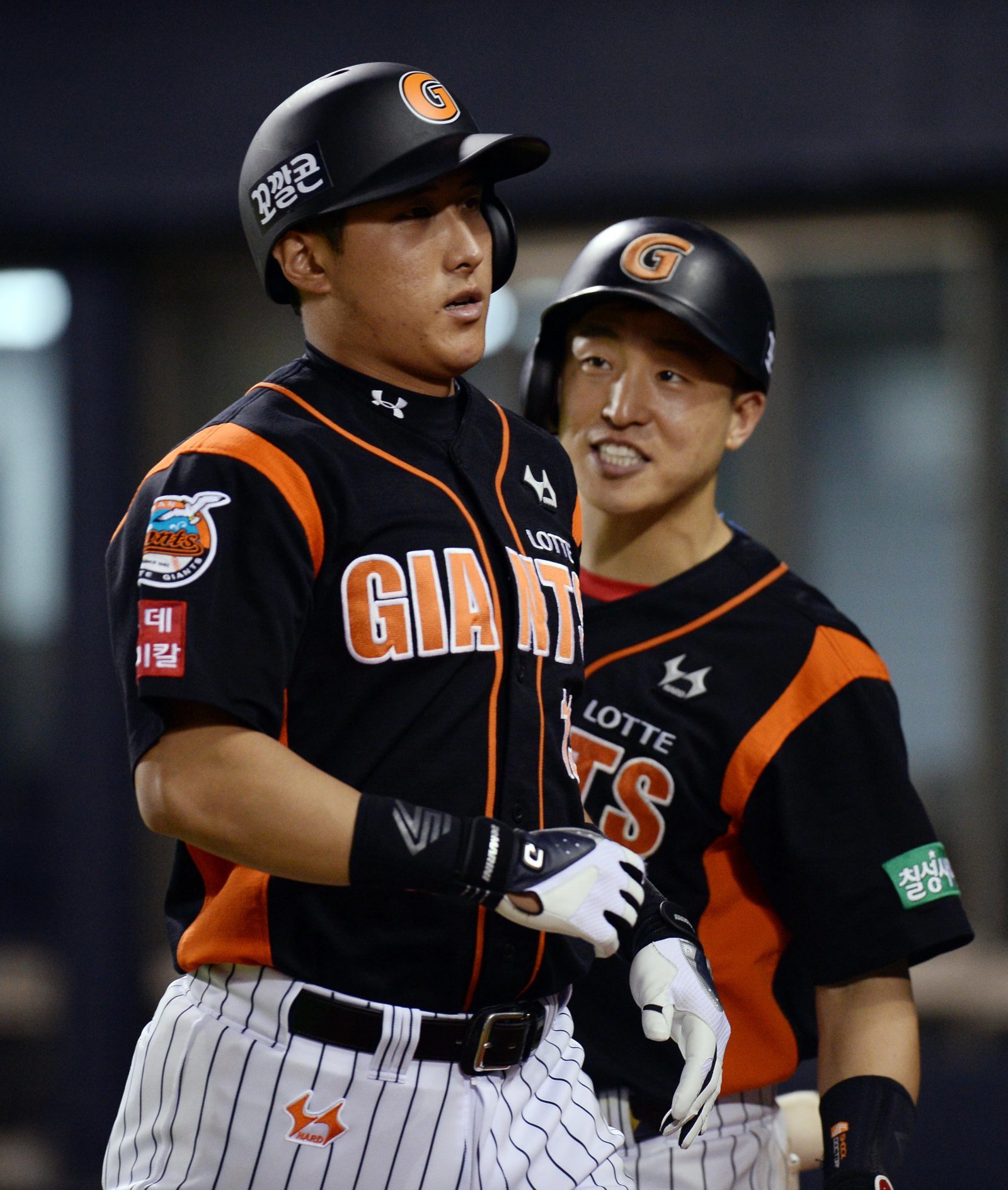 31일 오후 서울 잠실야구장에서 열린 2014 한국야쿠르트 세븐 프로야구 LG 트윈스와 롯데 자이언츠의 경기에서 9회초 1사 롯데 황재균이 좌월 솔로 홈런을 날리고 손아섭의 축하를 받고 있다. 2014.08.31 뉴시스