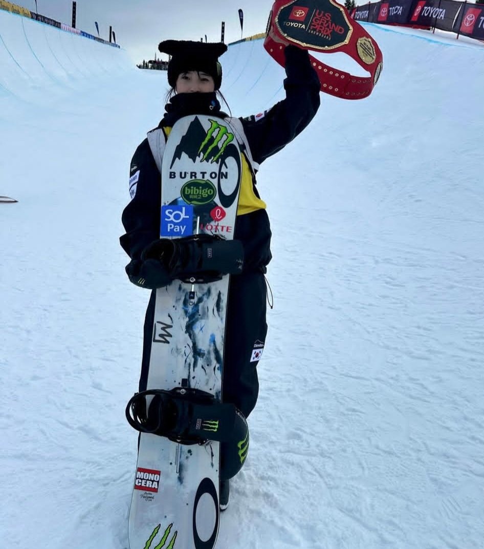 최가온이 지난달 미국 콜로라도에서 열린 2025~2026 국제스키·스노보드연맹(FIS) 하프파이프 월드컵에서 우승한 뒤 포즈를 취하고 있다. 사진 출처 최가온 인스타그램