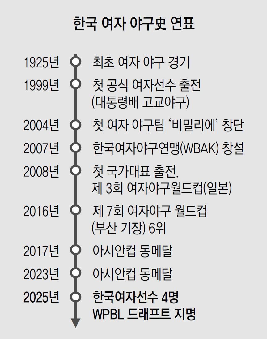 국내에 야구가 전해진 때는 미국인 선교사 필립 질레트가 당시 황성기독교청년회(YMCA) 회원들에게 야구를 가르친 1904년. 국내 최초 야구 경기가 열린 건 2년 뒤인 1906년이다. 초창기 선수들은 고의적삼을 입고 짚신을 끈으로 매어 신고 경기했다. 외야수는 맨손으로 공을 잡고 방망이는 단 한 개를 두 팀이 번갈아 썼다. 그러나 1930년대에 이르러서는 선수들이 ‘유니폼 입고 스파이크 신고’ 출전했다. 이때 신문에서 짚신 신고 경기했던 초창기 모습을 이미 “상상할래야 상상할 수 없는 ‘호랑이 담배 먹던 시절’일이다”고 한 걸로 보아 야구 여건이 크게 개선됐음을 알 수 있다. 야구는 1960∼1970년대 열광적인 고교야구 인기 시대를 지나 1982년 프로야구가 출범하며 폭발적으로 성장했다. 하지만 남자 중심이었다. 여자 쪽에는 선수도 팀도 없었다.