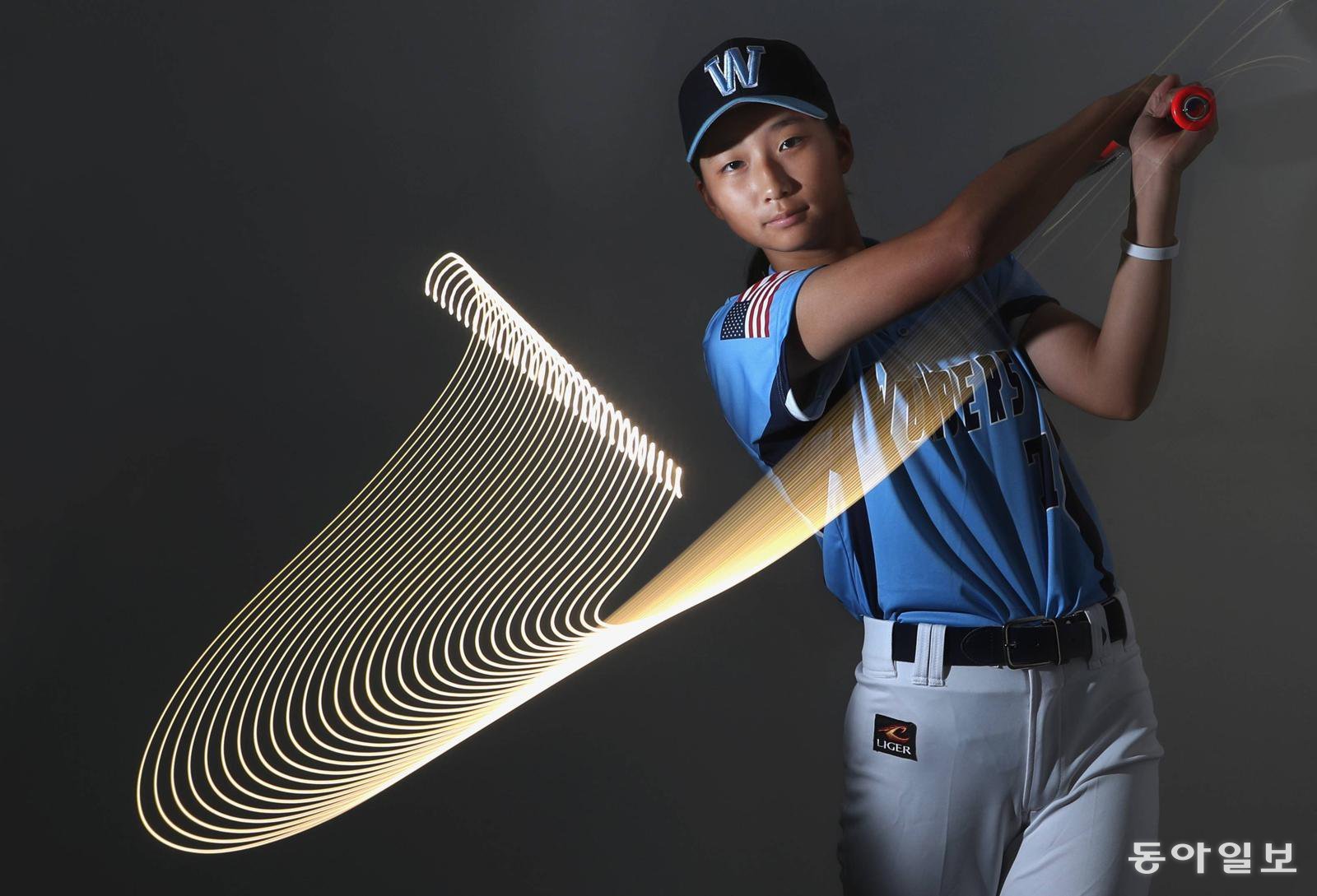 미국 여자프로야구리그(WPBL) 뉴욕에 지명된 박민서. 2019년 초청을 받아 아시아 선수 최초로 미국 최대 여자야구대회 ‘내셔널 걸스 베이스볼 토너먼트’에 출전했다. 당시 동아일보를 방문했던 박 선수가 스윙하는 모습. 배트에 발광다이오드(LED) 조명을 달고 저속 촬영했다. 장승윤 기자 tomato99@donga.com