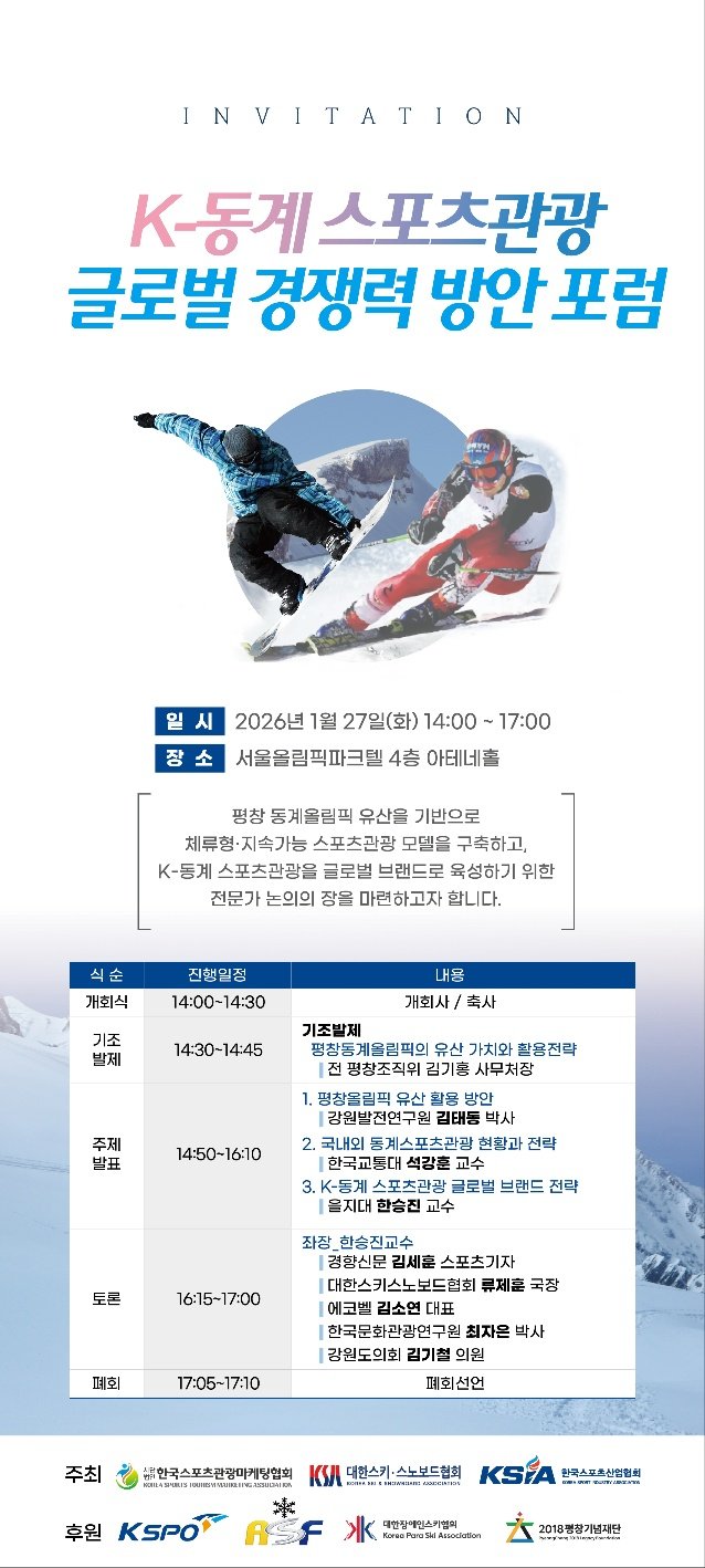 한국 겨울 스포츠관광의 미래 전략을 논의하는 ‘K-동계 스포츠관광 글로벌 경쟁력 방안 포럼’이 27일 오후 2시 서울 송파구 서울올림픽파크텔 4층 아테네홀에서 열린다.