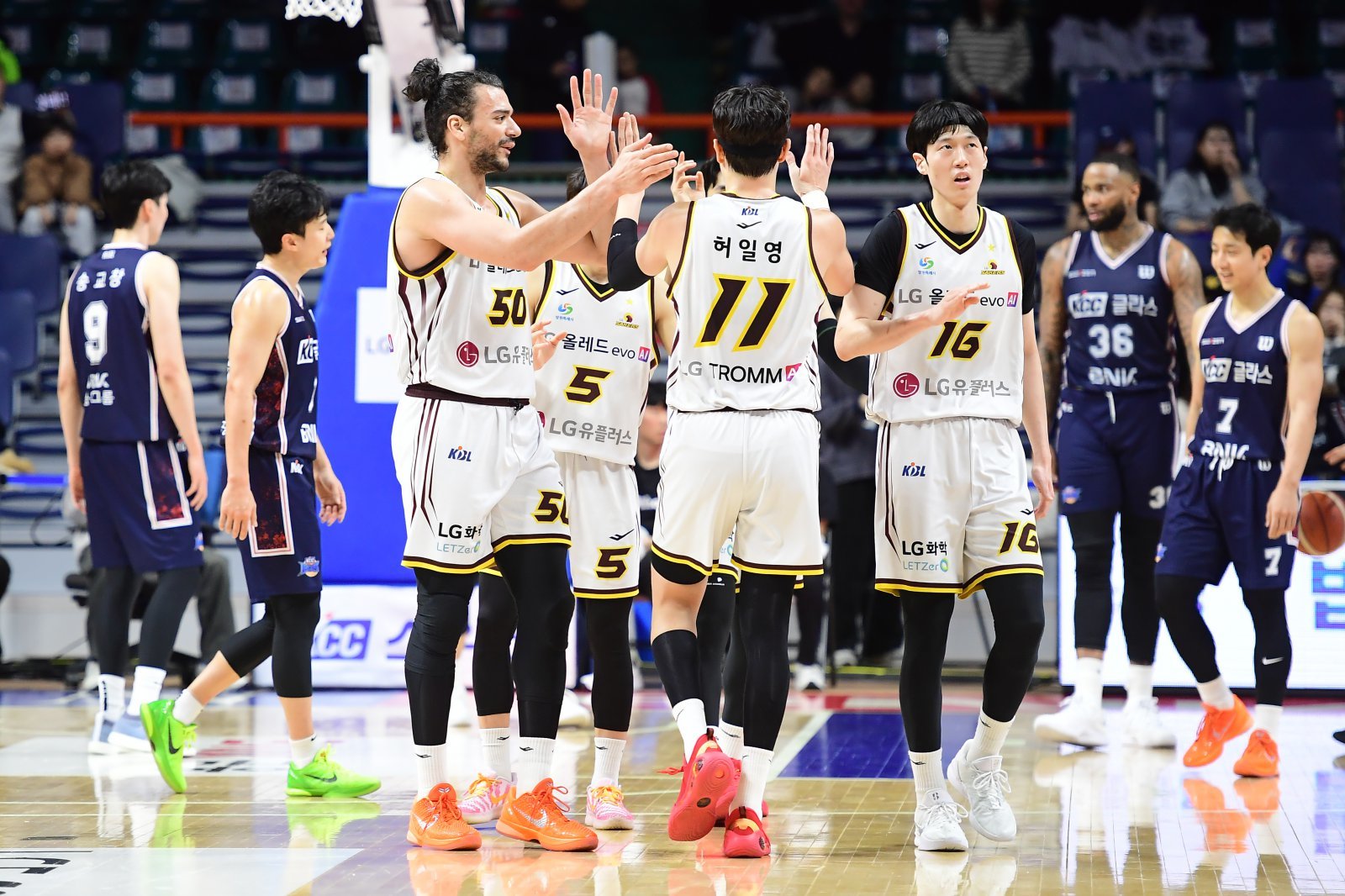 창원 LG가 23일 부산사직체육관에서 열린 2025-26 LG전자 프로농구 정규리그 원정 경기에서 부산 KCC를 82-65로 완파했다. KBL 제공