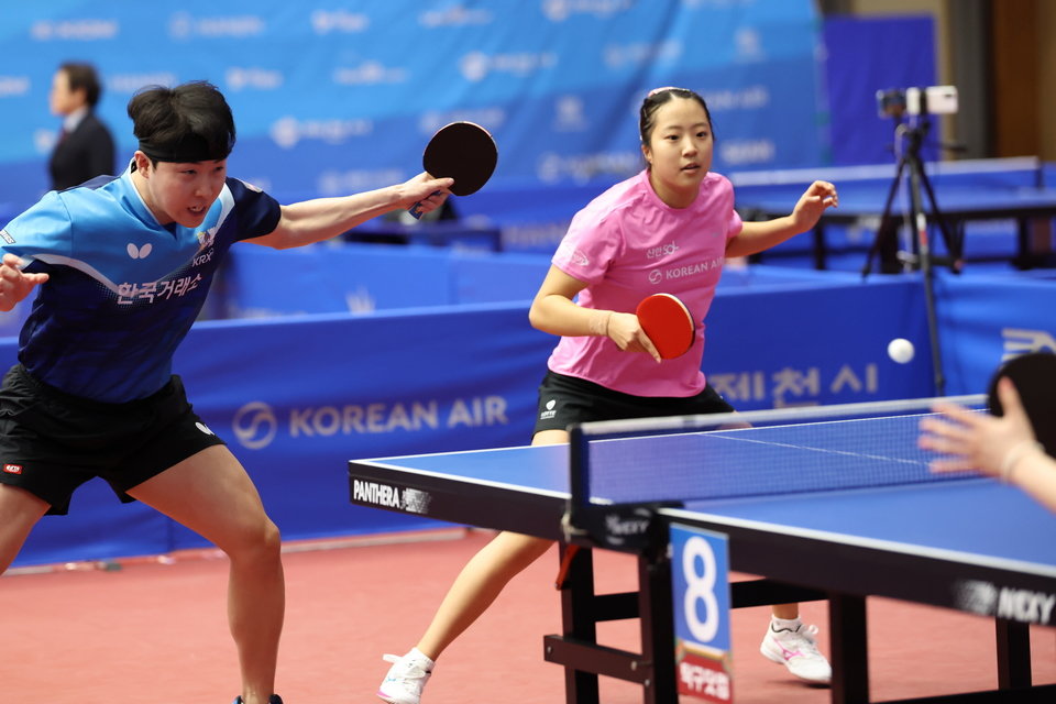 임종훈-신유빈 조는 26일 충북 제천체육관에서 열린 대회 혼합복식 결승에서 ‘디펜딩챔피언’ 조승민(28)-주천희(24·이상 삼성생명) 조를 3-1(11-2, 10-12, 11-9, 11-9)로 꺾고 우승을 차지했다.