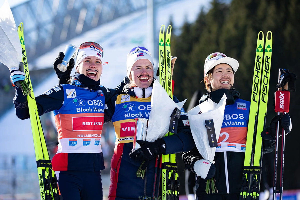 여자 노르딕복합 선수들이 2023년 3월 월드컵 시상식에서 남자처럼 콧수염을 붙인 채 세리머니를 하고 있다. 사진 출처 위다 베스트볼 한센 인스타그램