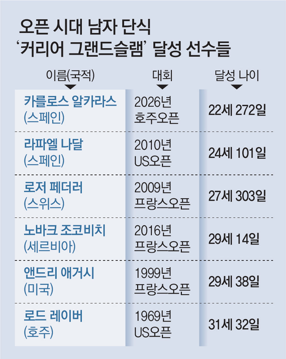 프로 선수가 메이저대회에 출전할 수 있게 된 1968년 이후(오픈 시대) 이 4개 대회 남자 단식에서 모두 우승한 ‘커리어 그랜드슬램’ 기록을 남긴 선수는 알카라스가 6번째다. 호주오픈 메인 코트에 이름을 남긴 로드 레이버(88·호주)가 1969년 처음 이 기록을 세웠고, 이날 알카라스에게 패한 조코비치가 2016년 다섯 번째 기록을 남겼다.
