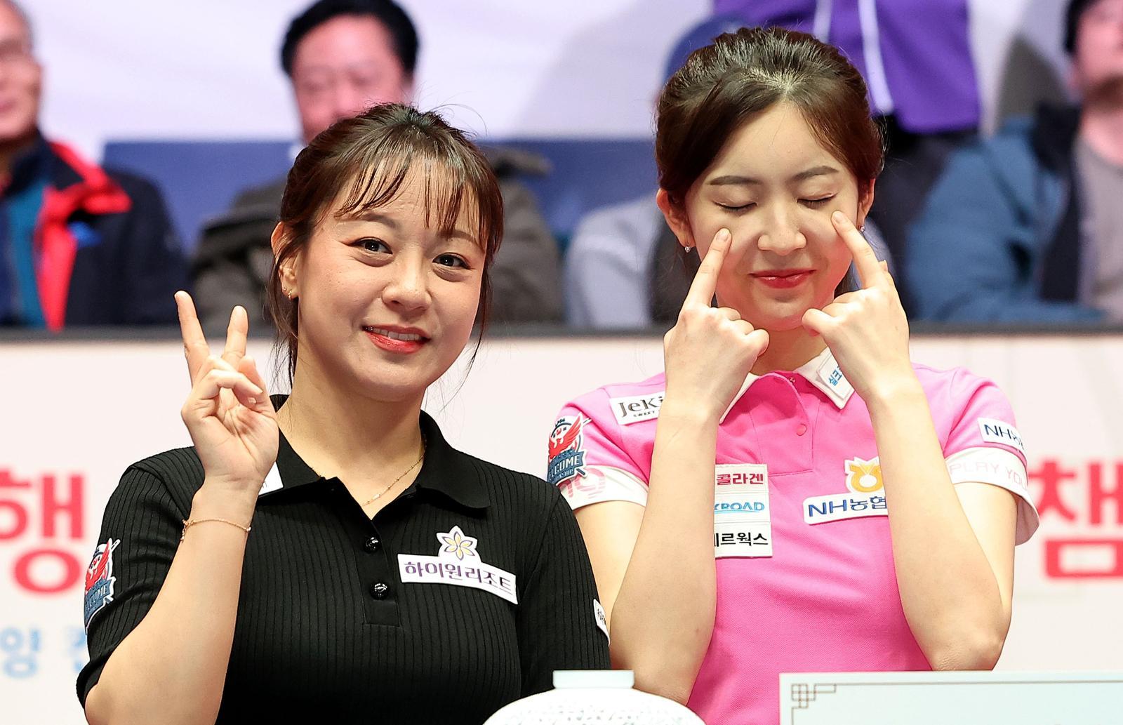 임경진(왼쪽)이 1일 2025∼2026시즌 프로당구 여자부(LPBA) 9차 투어 ‘웰컴저축은행 챔피언십’에서 우승한 뒤 결승 상대였던 정수빈과 함께 기념 촬영을 하고 있다. 프로당구협회 제공