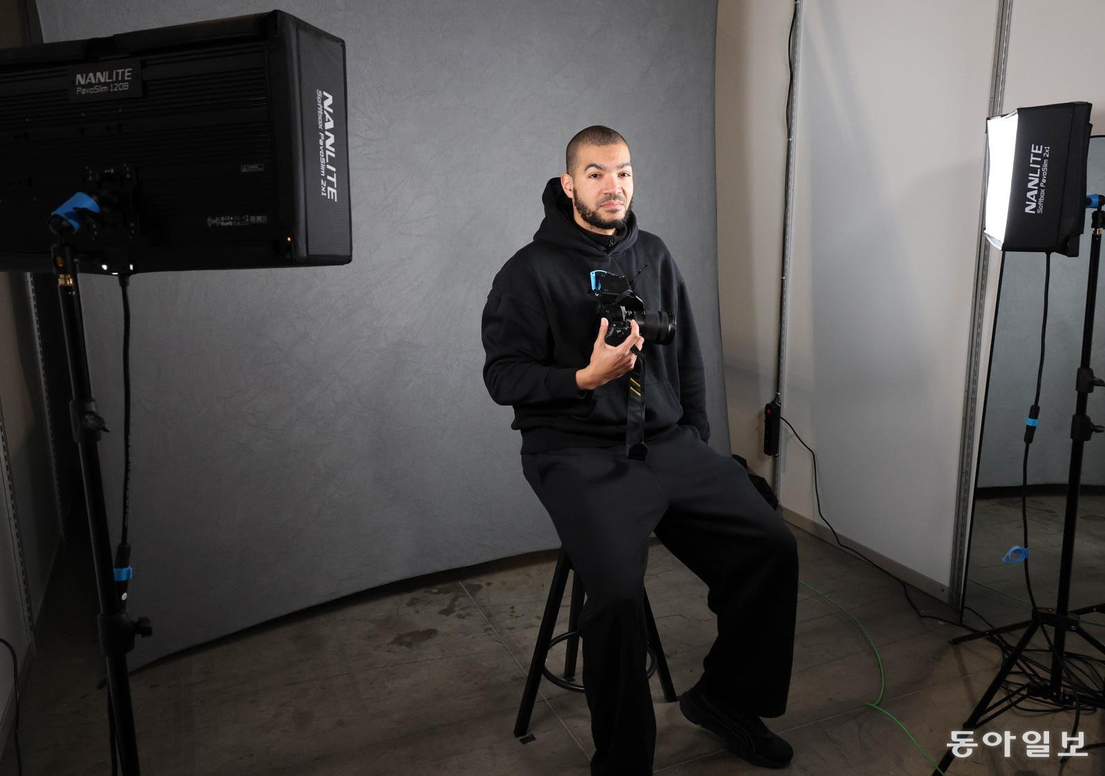 이탈리아 밀라노 스피드 스케이팅 스타디움에 있는 간이 스튜디오에서 선수들 공식 사진을 촬영하고 있는 조이 샤펠 작가. 밀라노=전영한 기자 scoopjyh@donga.com