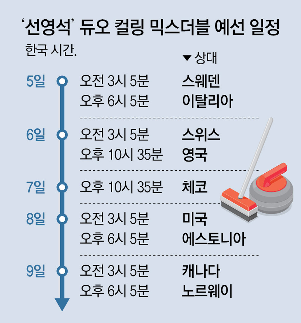 세계 랭킹 2위 ‘선영석(김선영+정영석) 듀오’는 4일 오후 7시 5분(한국 시간 5일 오전 3시 5분) 코르티나 컬링 올림픽 스타디움에서 스웨덴의 이사벨라(29)-라스무스 브라노(32) 남매와의 맞대결로 이번 올림픽을 시작한다. 선영석 듀오는 “피보다 더 진한 선영석의 케미를 보여주겠다”며 “첫 경기를 반드시 잡아 한국 선수단에 승리의 기운을 전하고 싶다”고 다짐했다.