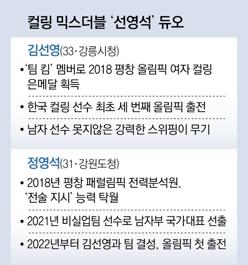 김선영-정영석 조는 지난해 12월 18일 캐나다에서 열린 올림픽 최종예선 플레이오프 마지막 경기에서 세계 랭킹 1위 탈리 길(27)-딘 휴잇(32) 조(호주)를 10-5로 꺾고 이탈리아행 ‘마지막 티켓’을 따냈다. 한국 컬링 믹스더블팀이 올림픽에 자력 출전권을 따낸 건 이들이 처음이다. 2018년 평창 대회 때 장혜지(29)-이기정(31) 조는 개최국 자격으로 자동 출전권을 받았다. 당시 장-이 조는 8개 팀이 참여한 예선에서 2승 5패로 최종 6위를 했다. 이번 올림픽 때는 10개 팀이 라운드로빈 방식으로 예선을 치른 뒤 상위 4개 팀이 메달 경쟁을 벌인다.