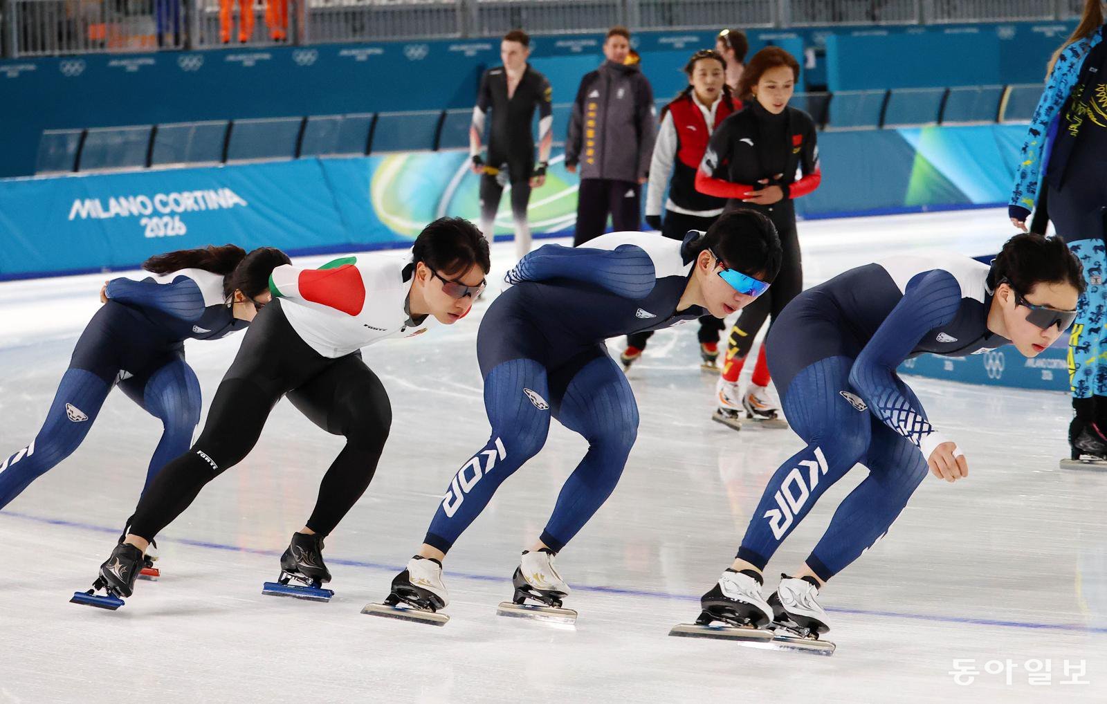 3일(현지시간)오후 이탈리아 밀라노 아이스 스케이팅 스타디움에서 스피드 스케이팅 한국 국가대표 선수들이 헝가리로 귀화한 김민석 선수와 함께 훈련하고 있다. 전영한 기자 scoopjyh@donga.com