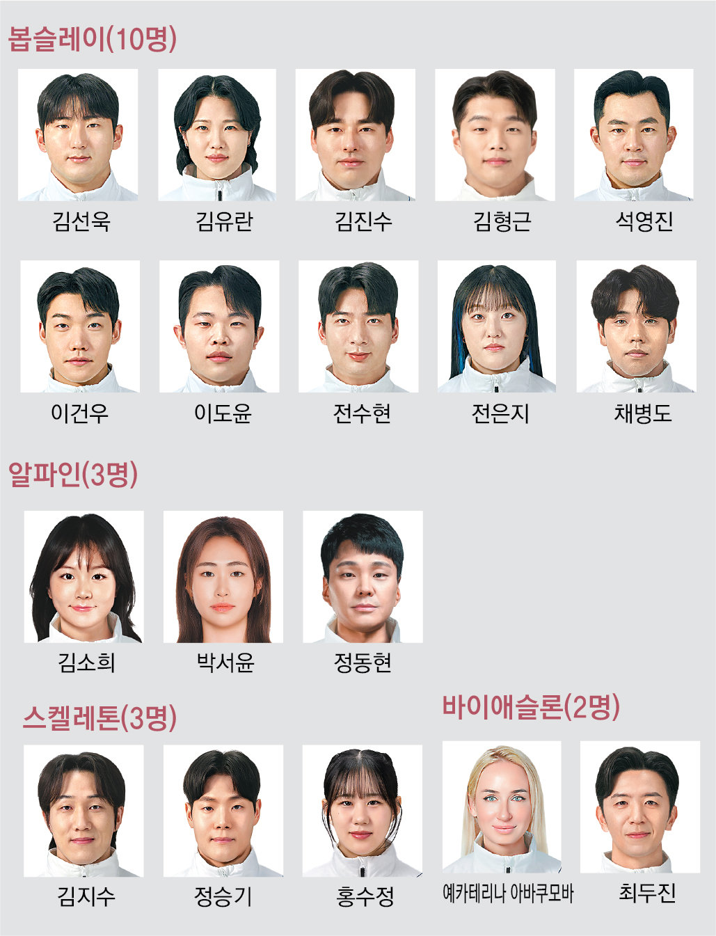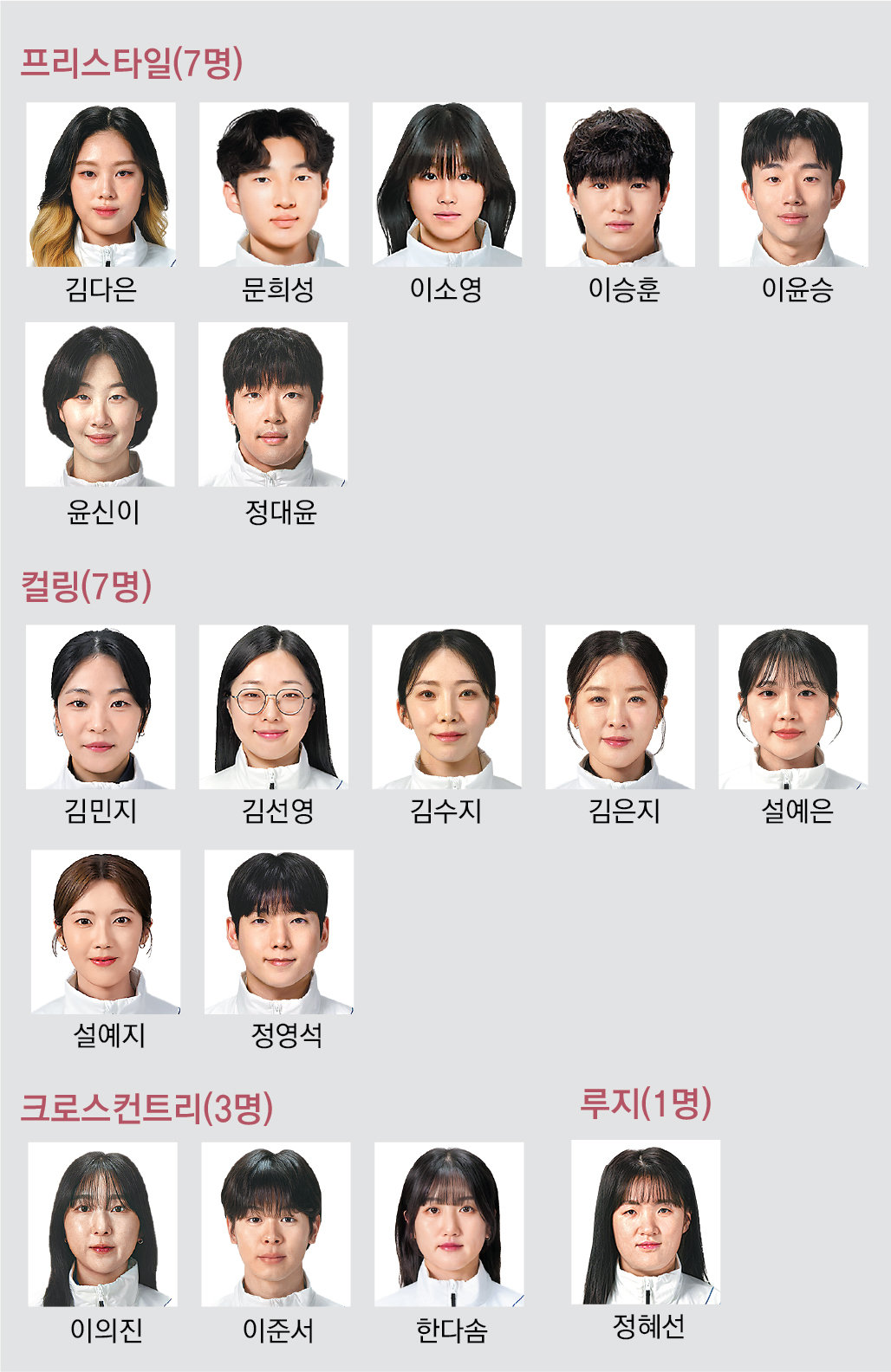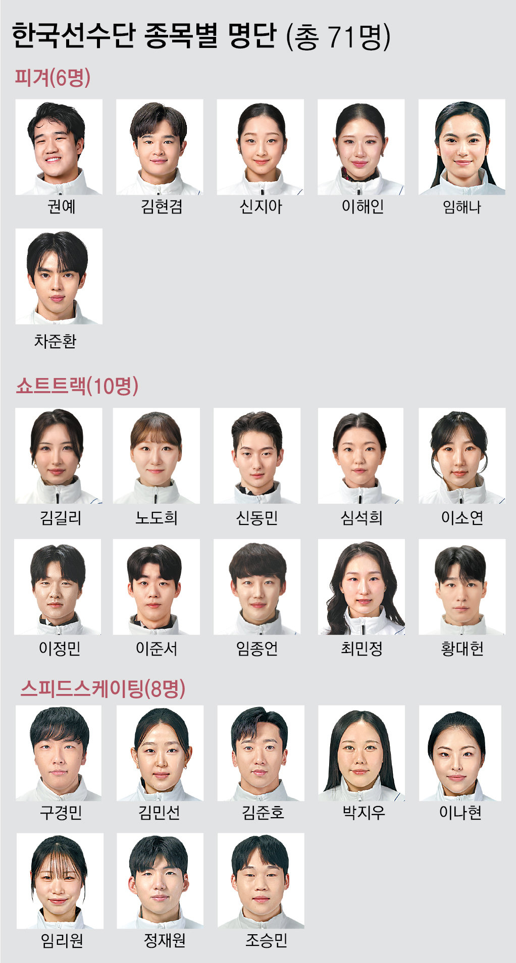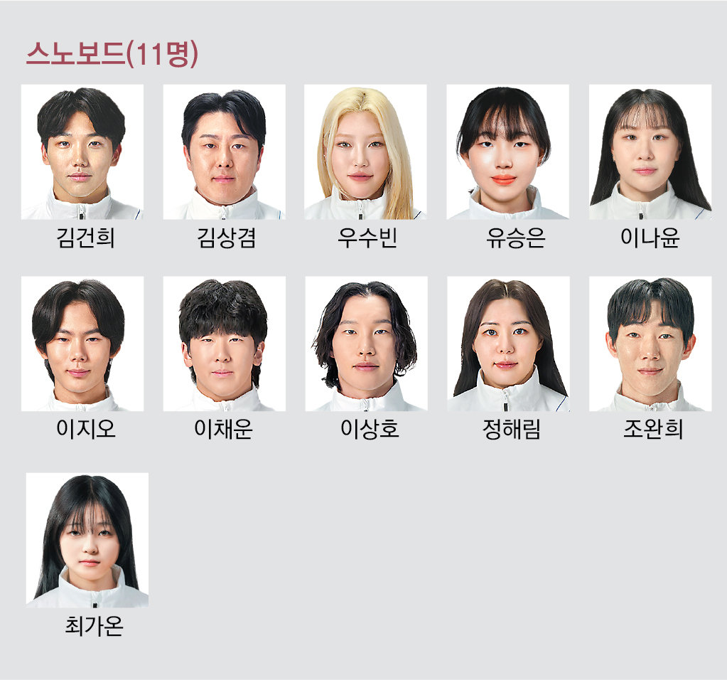 최민정이번 대회에서 ‘얼음 공주’ 최민정(28)은 올림픽 쇼트트랙 역사상 첫 개인 종목(여자 1500m) 3연패를 노린다. 또 ‘여고생 보더’ 최가온(18)은 한국 설상 종목 역사상 첫 올림픽 금메달에 도전한다. 스킵 김은지(36)가 이끄는 여자 컬링 대표팀 ‘팀 김’, 일명 ‘5G’도 한국 컬링 역사상 첫 올림픽 금메달을 정조준하고 있다. 한국 선수단은 여름, 겨울올림픽을 합쳐 399개의 메달을 획득하고 있어 이번 대회 첫 메달을 따는 선수는 통산 400번째 메달의 주인공이 된다.