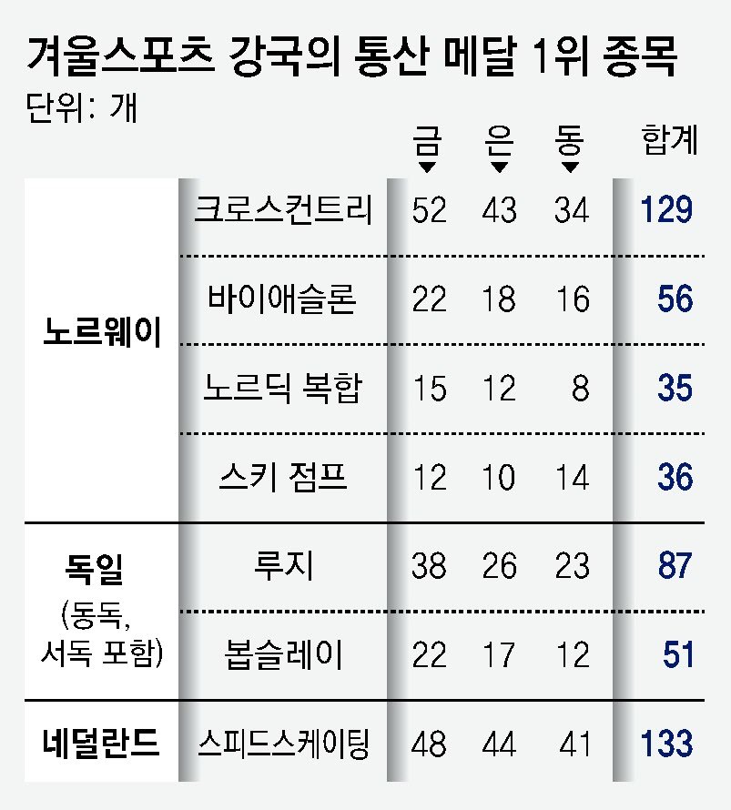 여름올림픽 때 한국 하면 양궁을 떠올리듯 겨울올림픽이 되면 특정 종목의 메달을 휩쓰는 겨울스포츠 강국들이 있다. 이들의 올림픽 역사는 천재성을 지닌 ‘슈퍼스타’ 한두 명에 의해 만들어지는 게 아니다. 겨울스포츠에 특화된 환경과 각국의 선수 육성 의지 등이 결합된 결과물이다. 4년마다 그려지는 ‘겨울올림픽 금메달 지도’에서 매번 같은 국가들이 금빛으로 물드는 건 우연의 산물이 아니다.